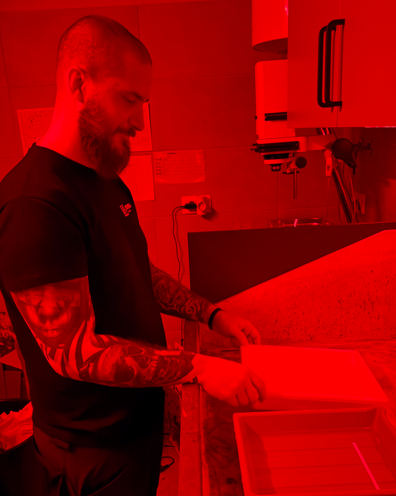 Working with old family photographs in this way reminded us that photography does not always have to begin with a camera. By scanning an existing print, preparing it carefully, and contact printing it onto glass, we were able to give images from family albums a completely new physical presence. The process is slow, deliberate, and hands-on, but that is precisely where its value lies.