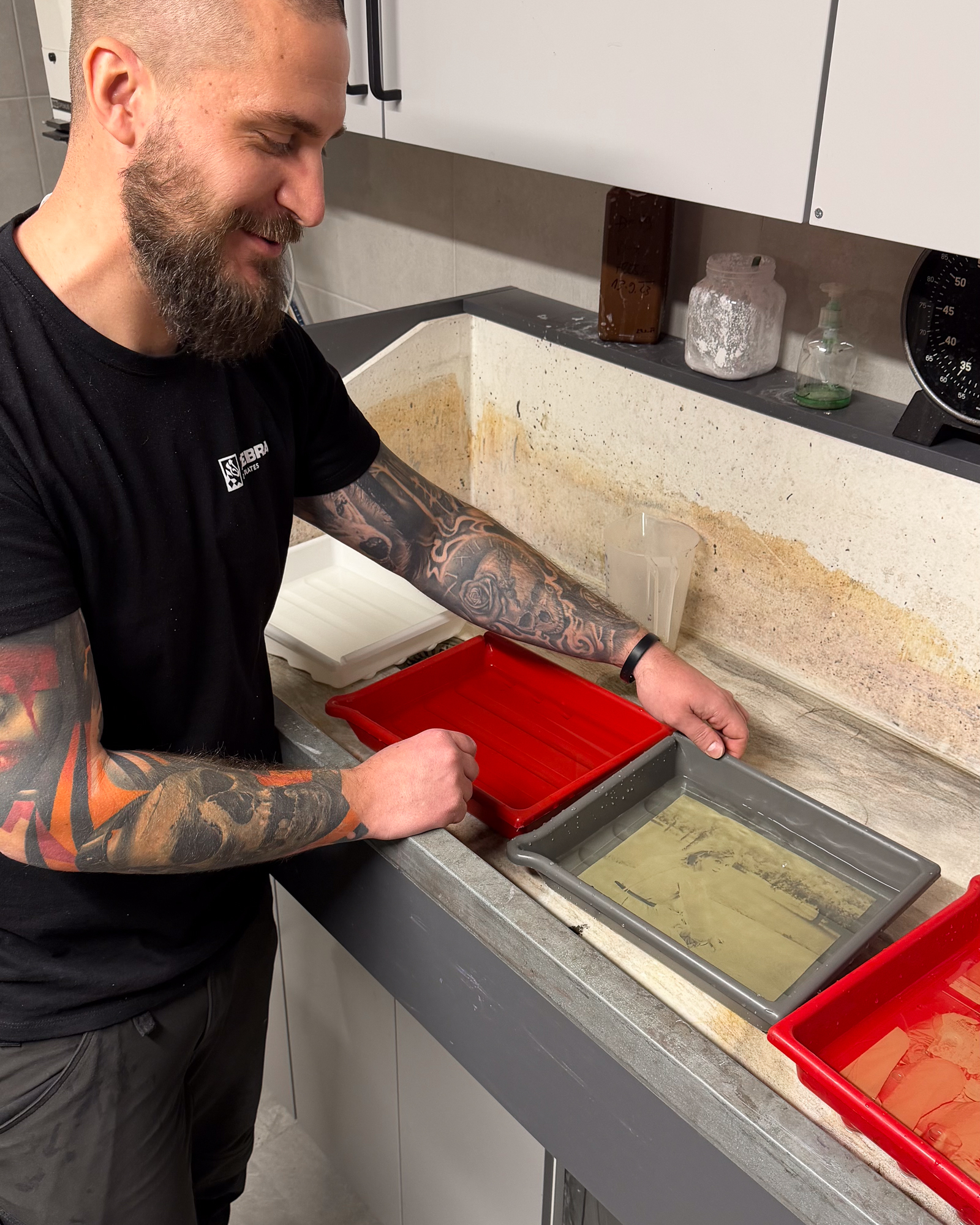 Before printing, the image must be mirrored. We actually forgot to do this ourselves, so this is an important detail not to miss. If the transparency is not mirrored, the final glass plate will be laterally reversed.
