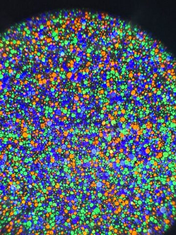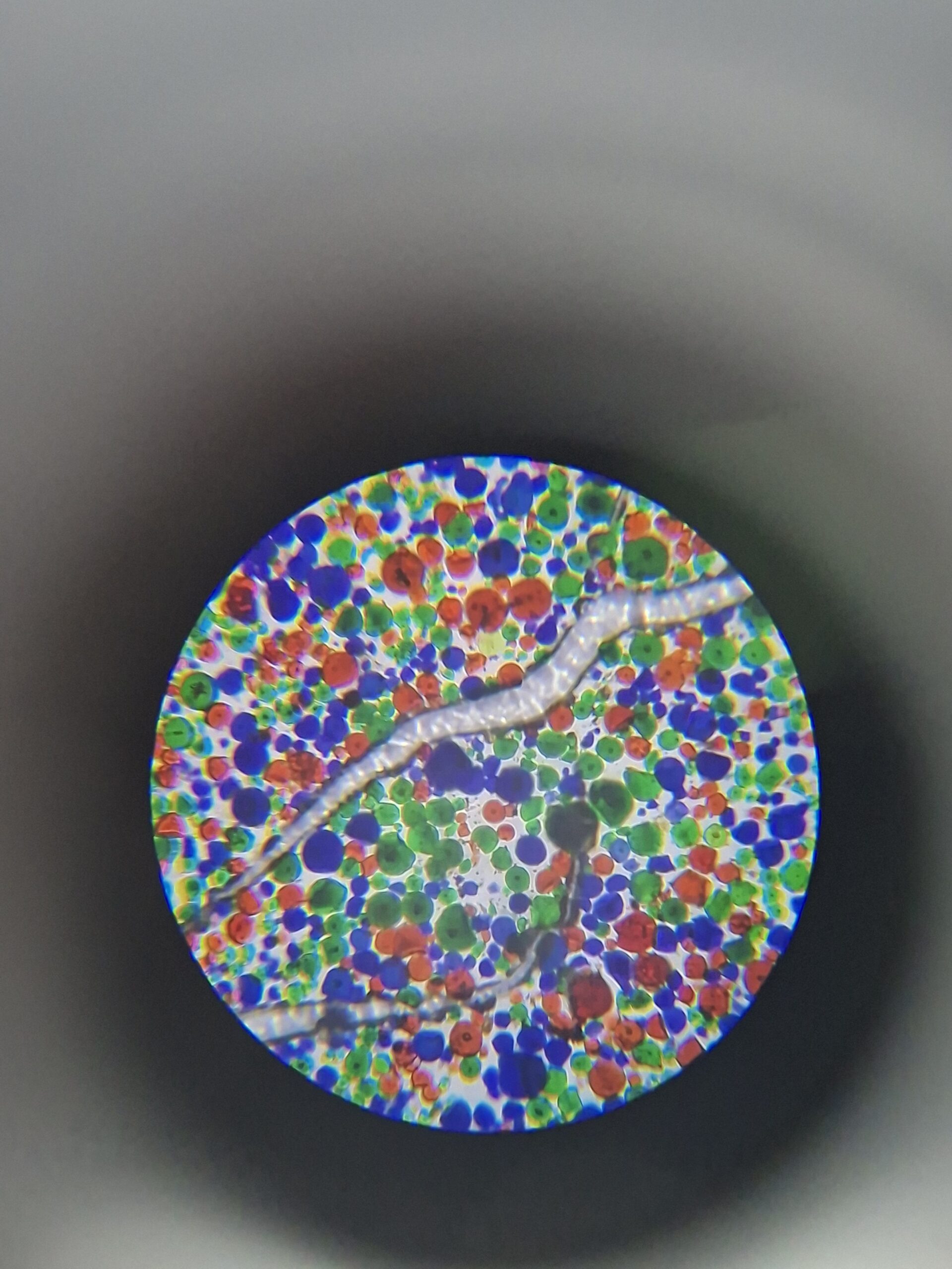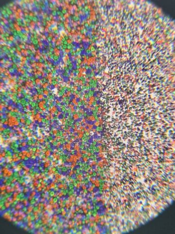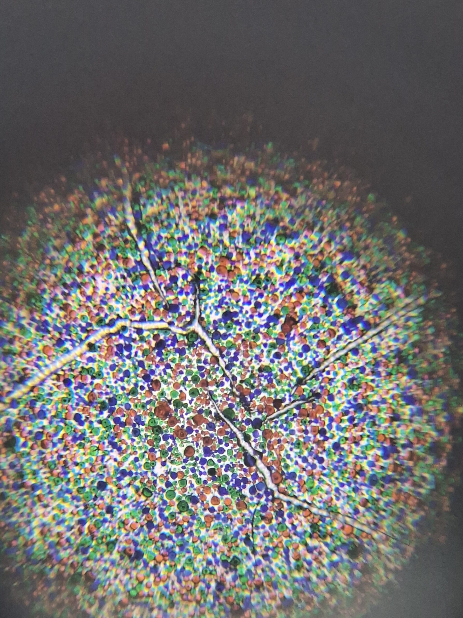 A surface composed of millions of microscopic dyed starch grains, acting as a random yet functional mosaic of color filters.